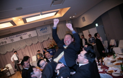 内容 | 阿部出委員長のオープニングムービーで始まり、卒業生がそれぞれのテーマソング(?)で入場しました。佐藤正廣理事長より卒業生へ感謝状が授与され、卒業生一同からは記念品が贈呈されました。 現役メンバーから卒業生への追い出し状は、楽しい思い出をもとにそれぞれ工夫された演出で行い、会場は終始笑いに包まれていました。 答辞では卒業生一人ひとりが今までのJCライフを振り返り、現役メンバーに思いを伝え笑いあり、感動の涙ありの卒業式でした。 |